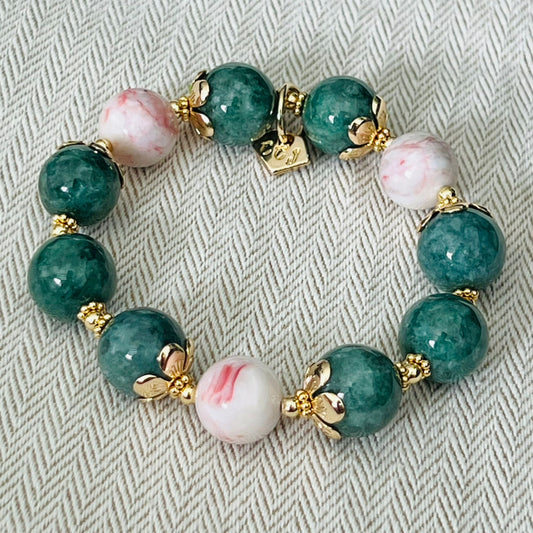 Green Pea Jade & Cinnabar In Quartz Bracelet